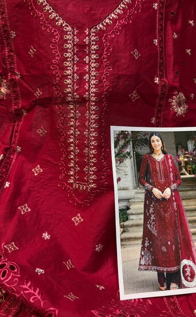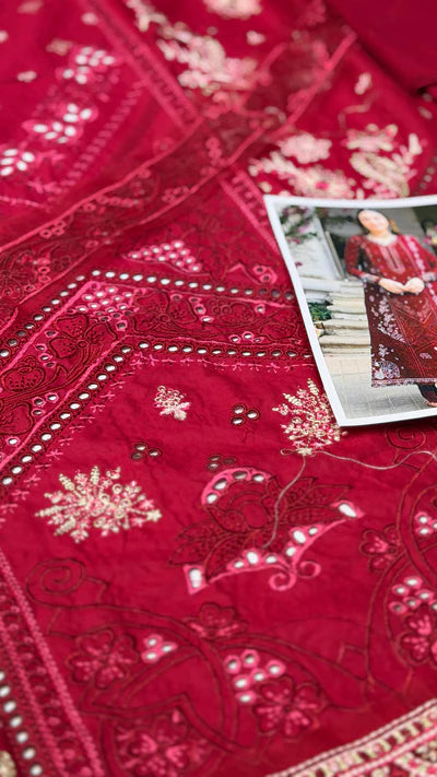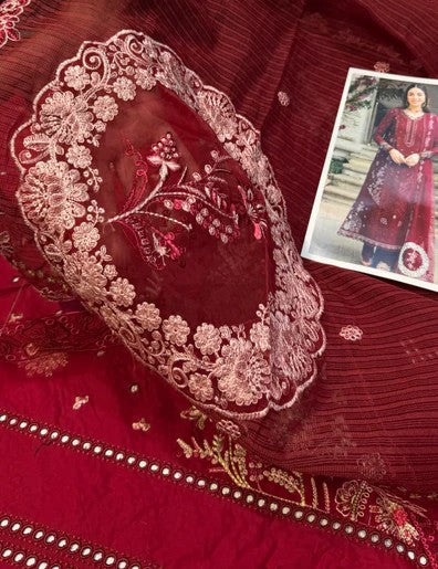 Luxury LAwn 3pc Chickenkari Outfit with ready to wear cotton net Duppata with applique pallu