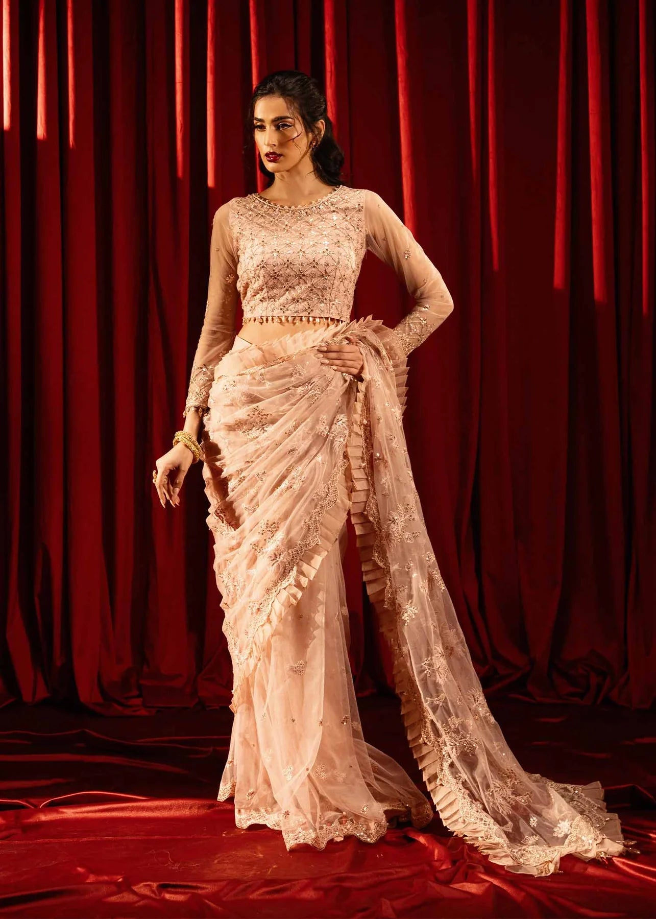 4pc Net fabric saree with inner and handmade stone work on body and pallu